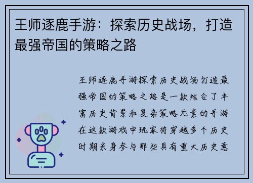 王师逐鹿手游:探索历史战场,打造最强帝国的策略之路