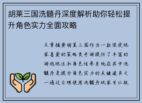 胡莱三国洗髓丹深度解析助你轻松提升角色实力全面攻略