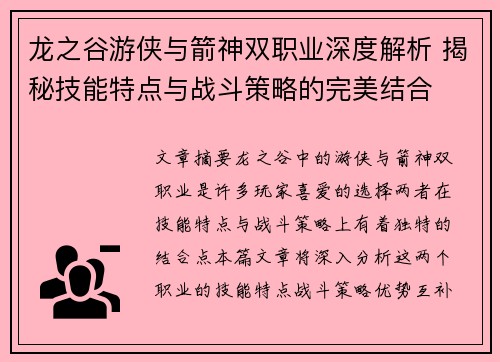龙之谷游侠与箭神双职业深度解析 揭秘技能特点与战斗策略的完美结合